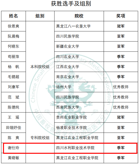 四川水利职业技术学院生物工程学院谢仕玲老师在中国畜牧兽医学会小动物医学分会主办的第六届兽医临床青年教师教学比赛中表现优异,喜获专科院校组季军。