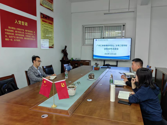 10月18日上午,广州汇标检测技术中心教育项目部商务副总监、校企合作业务总负责人、西南大区总负责人梁梓枫到校洽谈企校合作。生物工程学院党总支书记罗亚东、食品生物技术专业负责人赵露和实训教师张晶晶出席本次洽谈会。