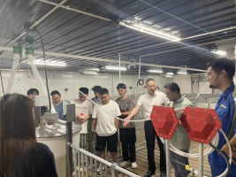 活动第一部分为实训基地参观及实训指导活动。参访团一行到达巨星集团集贤猪场,在公司总经理兼产业导师唐春祥的陪同带领下,由实训基地主任兼育肥教练刘浩宇担任讲解,参观了巨星产业学院实训基地,了解了基地运作实际情况和现代化养猪技术的相关实践知识并接受了唐春祥导师的实践指导,增强了学生书本之外的实践认知。随后,学生在实训基地兽医专家韩学富和设备专家马金平两位老师的讲解指导下在基地实操室进行实训实践。